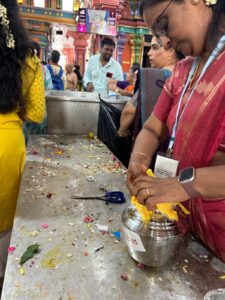 タイプーサムに男性は (男性が多いですが、中には女性もいます) 髪を剃る習慣があります。そうすることで祈りの成就を願ったり、ムルガン神への忠誠心、感謝を身体で表します。お礼に行ったところ、頭を剃った方がたくさんいらしたので、同じようにタイプーサム後のお参りに来ているようでした。